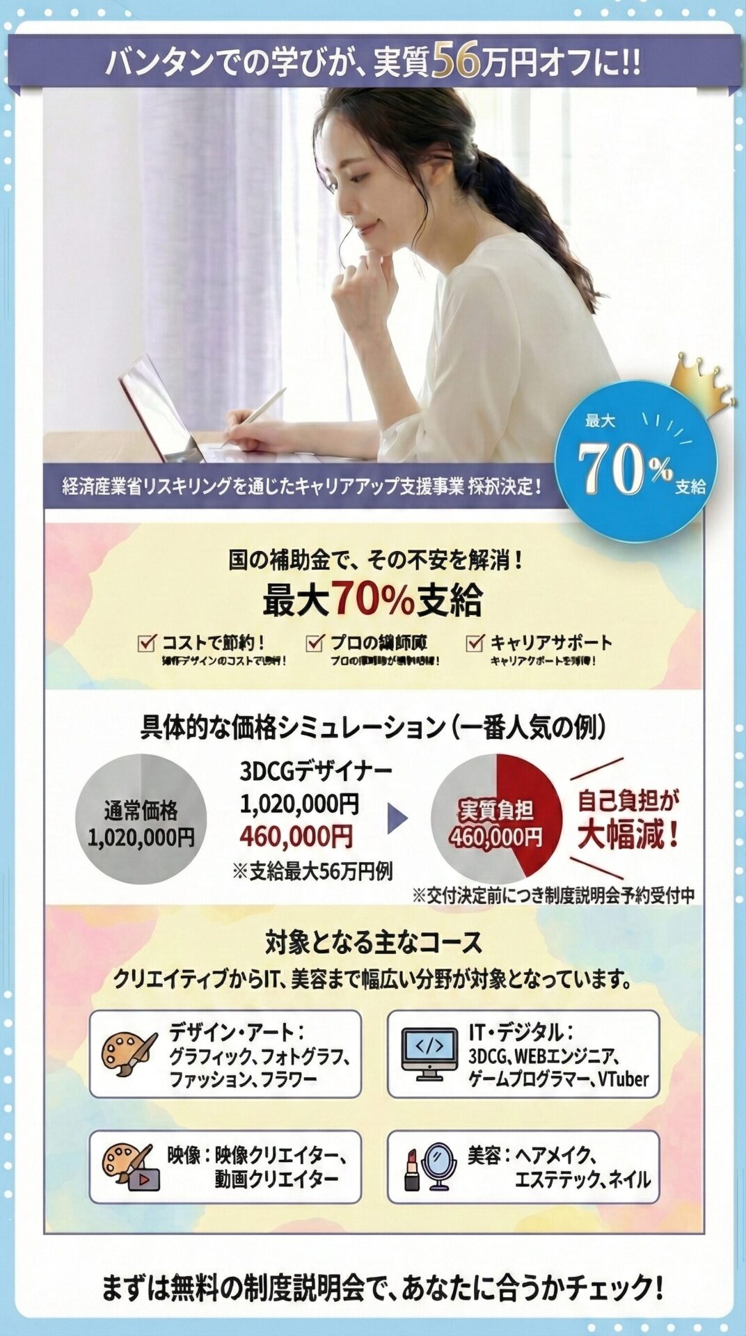 「今の仕事に不安がある」「クリエイティブな仕事に挑戦したい」 そんなあなたの第一歩を、国とバンタンが強力にバックアップします。